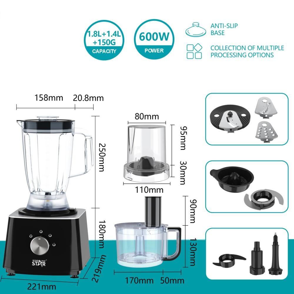 خلاط متعدد الوظائف ويننج ستار بقدرة 600 واط، يجمع 10 وظائف في جهاز واحد، منها تحضير العصائر، الفرم، الطحن، والعجن. مزوّد بشفرات ستانلس ستيل قوية لخلط ناعم وسريع، ، ونظام طرد لب أوتوماتيكي لراحة الاستخدام. تصميم متين وأنيق، يعمل بهدوء وسهل التنظيف، ليكون الخيار المثالي لكل مطبخ عصري
